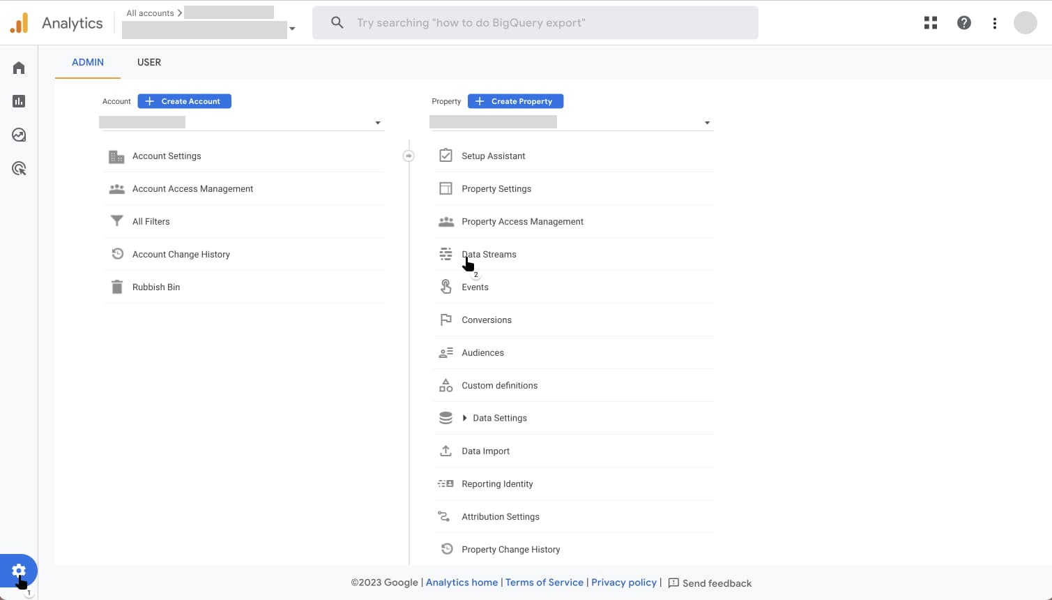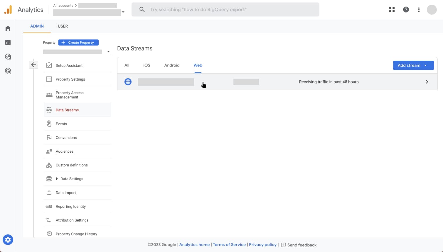 Steg 3. I vänstermenyn, välj Admin. I huvudvyn under menyn Property, välj Data Streams.