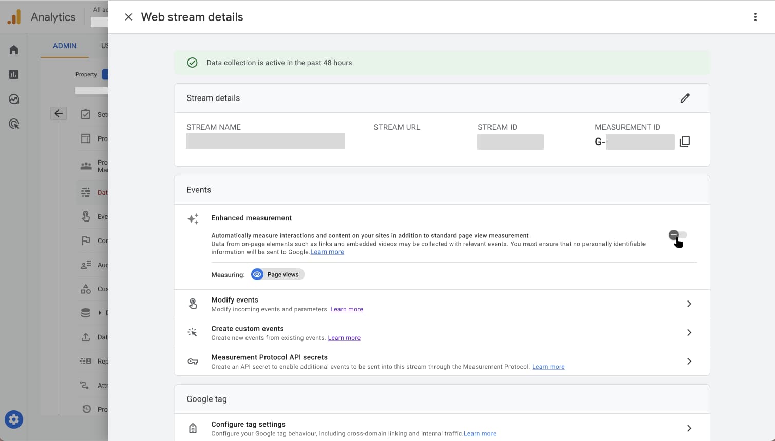 Du kan, om du vill, konfigurera enhanced measurement; dock är den utökade page view-spårningen aktiverad som standard och kan inte stängas av.