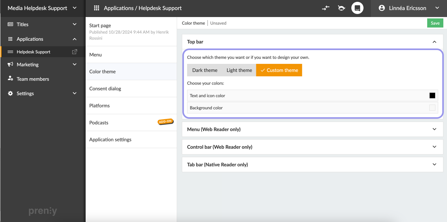 Farbdesign in der Webanwendung ändern - Prenly