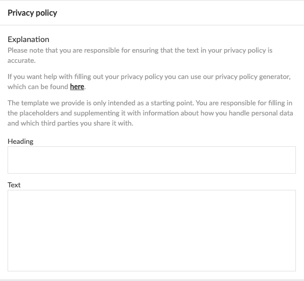 Als Nächstes können Sie entweder vorhandene Inhalte einfügen, oder, falls Sie keine bestehende Datenschutzrichtlinie haben, können Sie unser Tool verwenden, um eine neue Datenschutzrichtlinie zu erstellen: https://privacy.prenly.co/