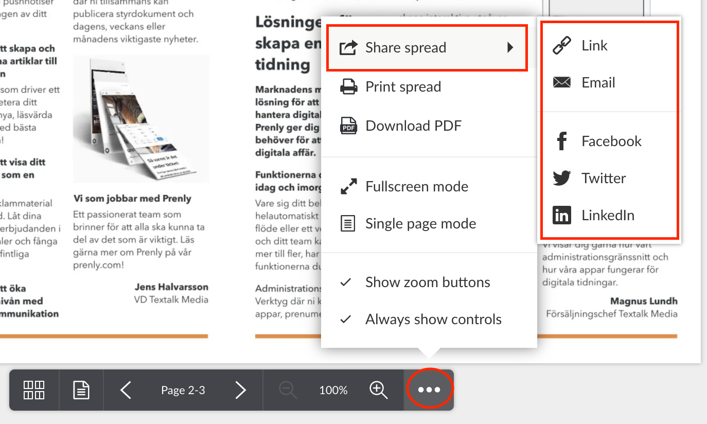 In der Ausgabe gibt es ein Menü in der Mitte -> klicken Sie auf das "Drei-Punkte-Menü" -> und wählen Sie dann"Spread teilen" aus dem PDF-Modus. Hier sehen Sie alle verschiedenen Möglichkeiten und Plattformen, auf denen Sie Artikel oder Doppelseiten teilen können.