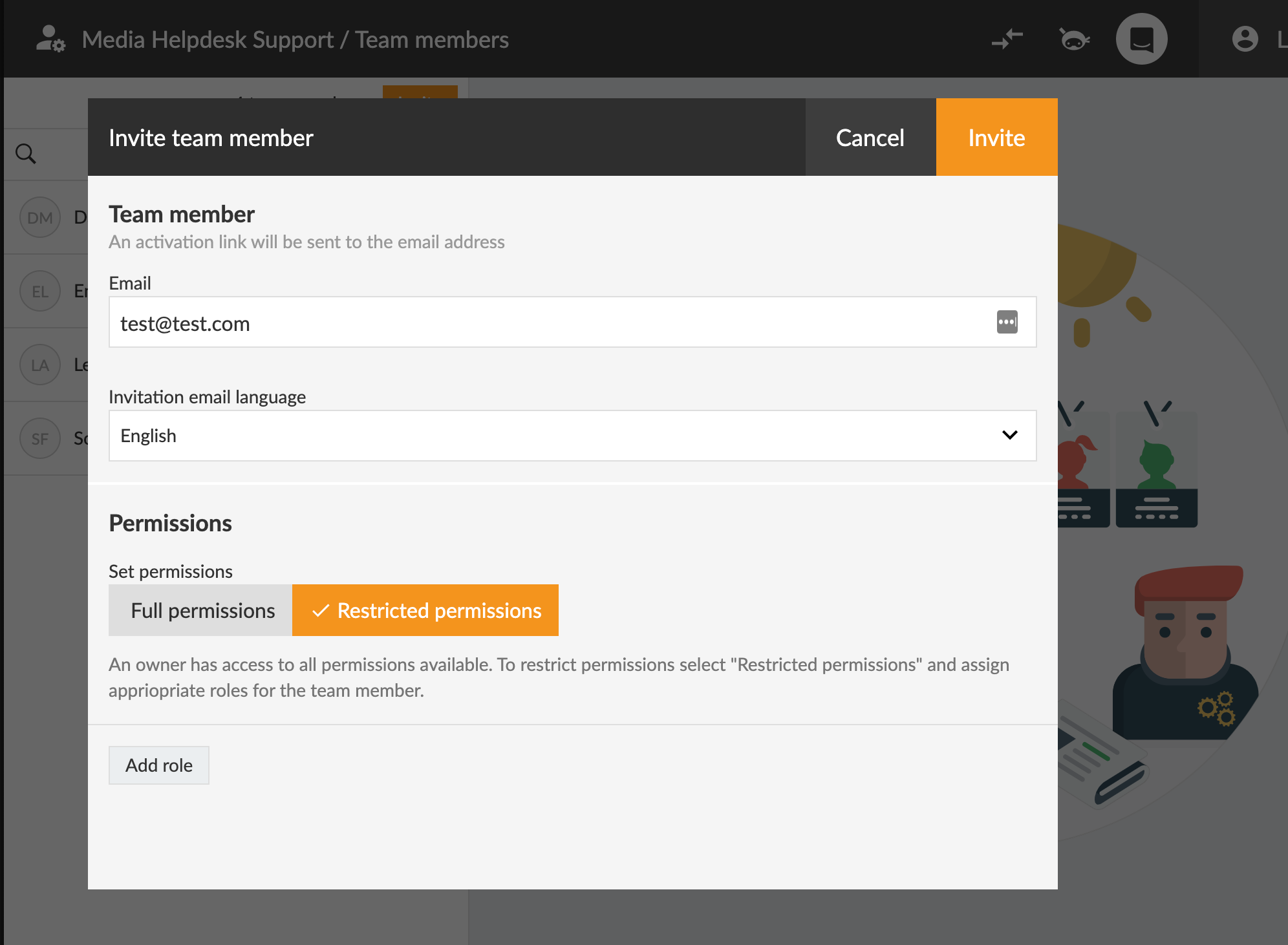 5. Enter the e-mail address of the person you want to invite, choose which right and role they will get and finally click on the Invite button at the top.