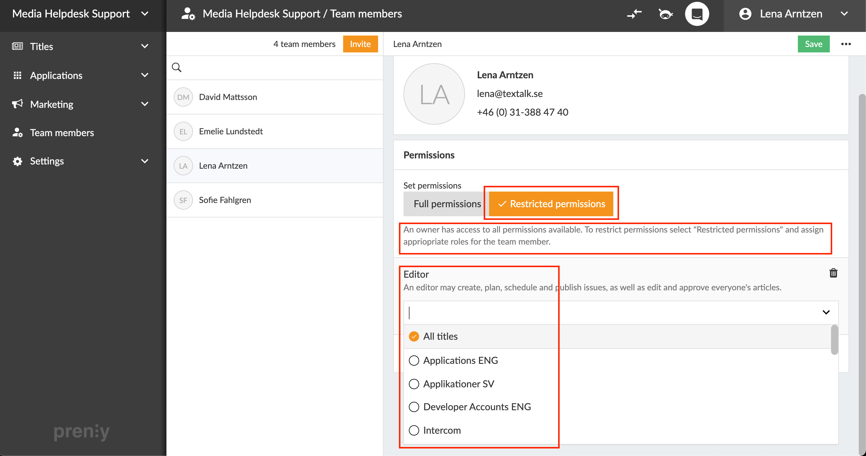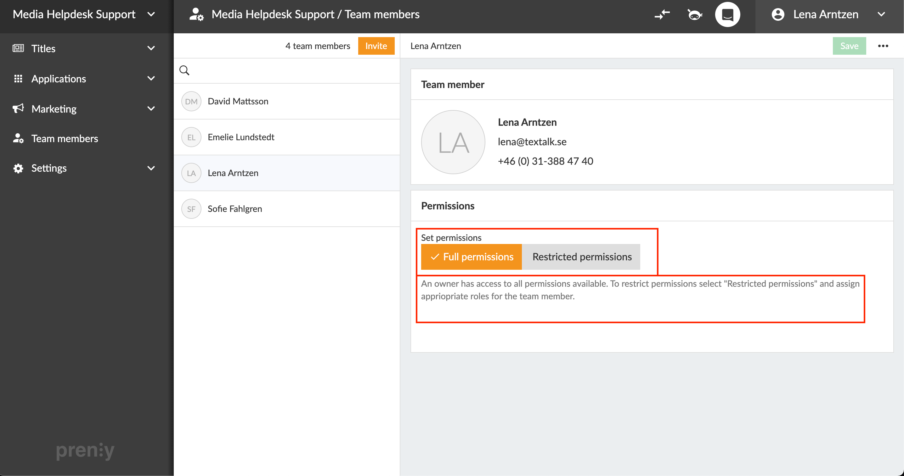 We always give the main contact who is the owner of your Prenly Workspace Full Permission. It gives them access to all functions in the system as well as the right to administrate and invite new team members.