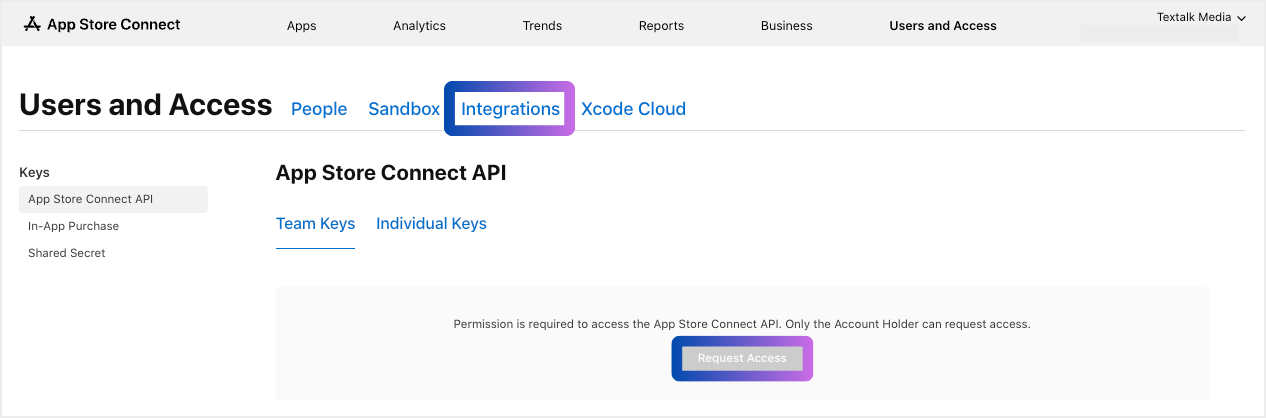 Step 2. Select "Integrations", and then click "Request Access" to be enable the App Store Connect API.