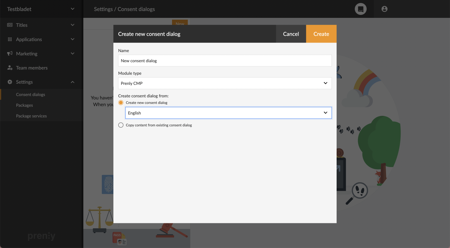 A window appears in which the module is to be created. Start by filling out its desired name. Then choose which type of module you want to use. (Prenly CMP is the standard preset, but you can also choose Didomi, Cookiebot or Usercentrics if these are used by your company and have been enabled) Finally you have to choose if you want to generate a new standard dialog text (and also in what language) or if you want to copy the dialog from an already created module. Then click Create to create the module.