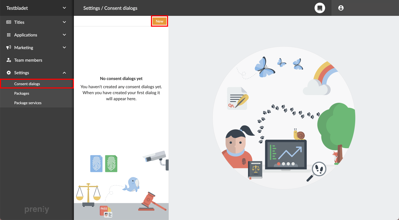 Start by logging into Prenly Workspace and going to Settings -> Consent dialogs -> click New.