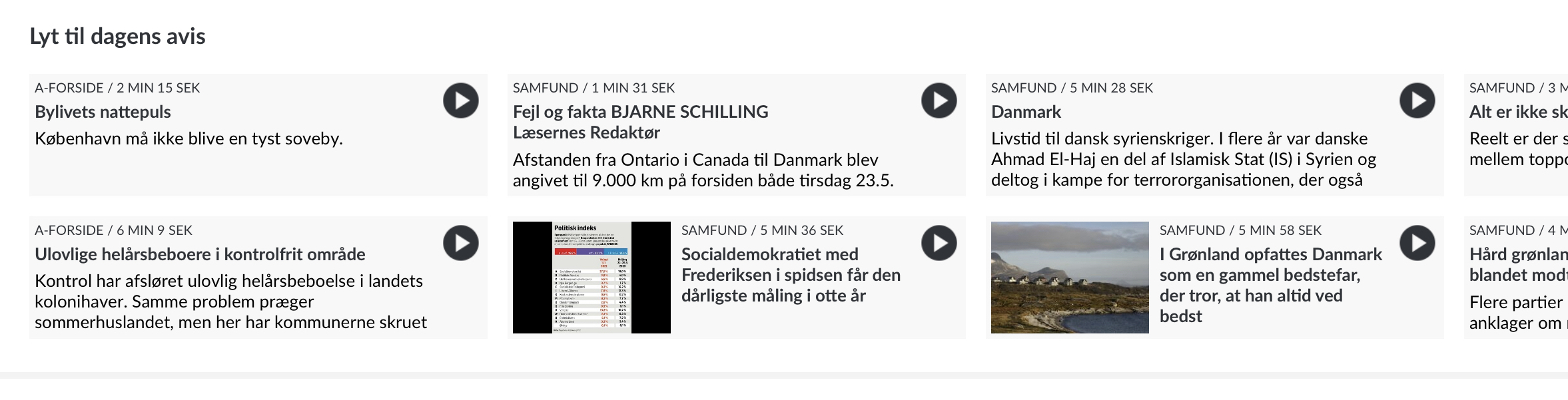 Article audio in the form of mp3 files has higher quality than the built-in speech synthesiser and in May 2023 it is only available in the Politiken e-journal. An integration with a speech server that can receive texts and create mp3 files is required.