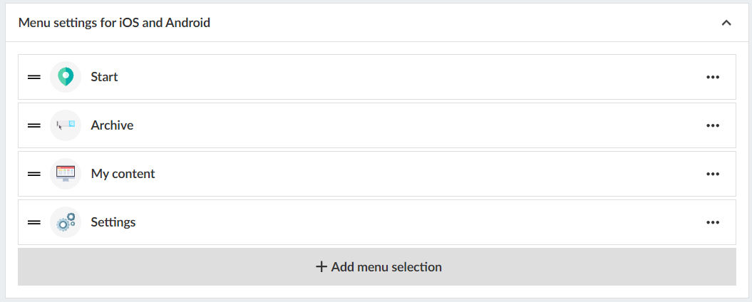 You can create your own menu in your app. It is possible, for example, to add external links, cookie and privacy policies. For each menu item, you can choose from a number of different icons.