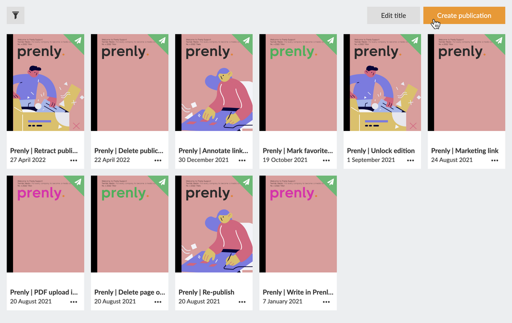 Regardless of what you want to write, you first need to select a publication to host your PDF. Select the publication of the Prenly title of your choice by touching the publication card either on the cover image or name field.