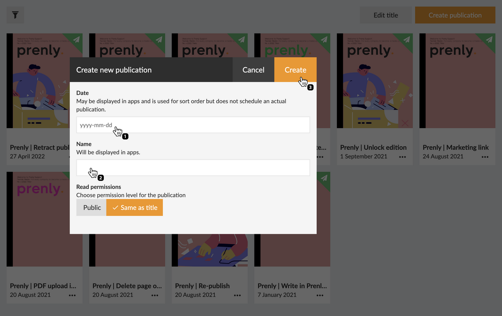 Once you are happy with the configuration, select "Create" to create your new publication. Prenly will, by default, use your chosen delivery date as the publication name when Prenly automatically creates a new publication; but you are free to select whatever name you would like.