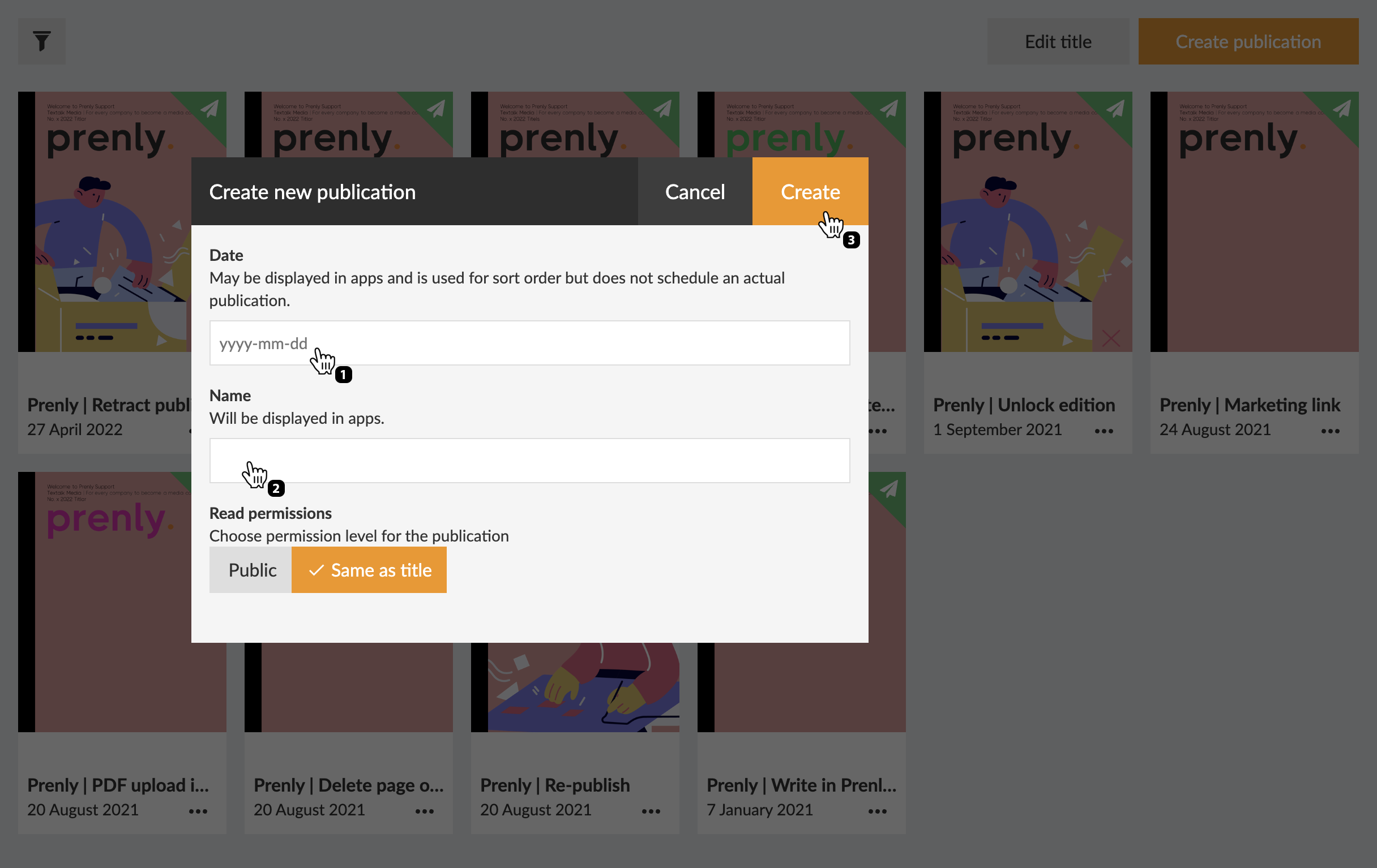 If the publication does not exist, select the button "Create publication" to create a new publication on the selected Prenly title. Enter a delivery date and name. Select whether the publication should be public or "Same as title" to use the title's general read permissions settings. Once you are happy with the configuration, select "Create" to create your new publication. Prenly will, by default, use your chosen delivery date as the publication name when Prenly automatically creates a new publication; but you are free to select whatever name you would like.