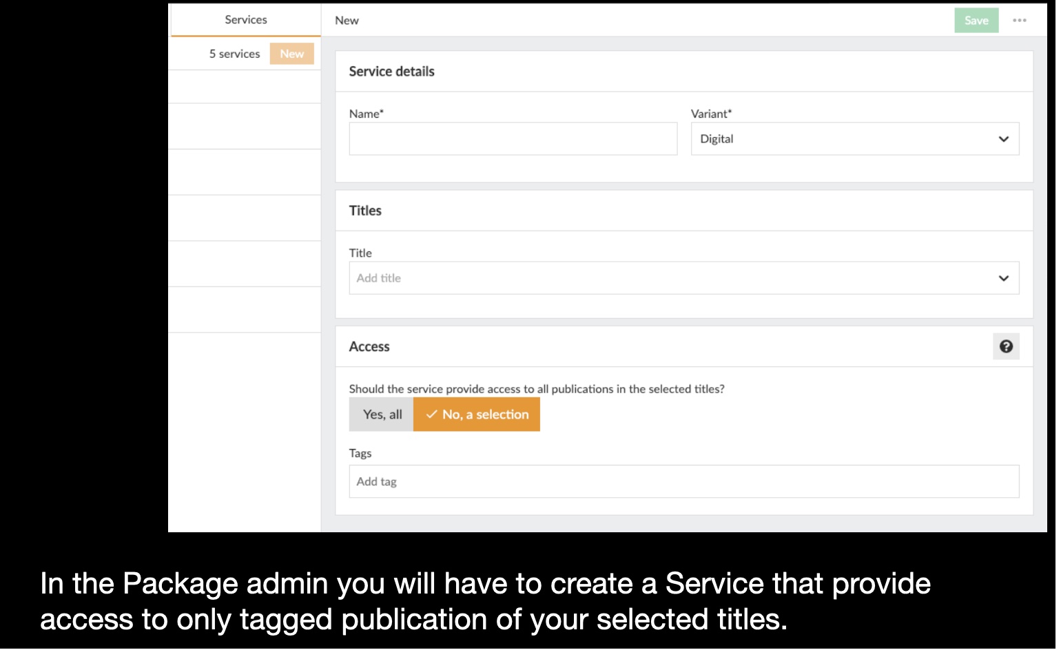 Add a name to the service, select title and add the same tag that you have added to the publications.
