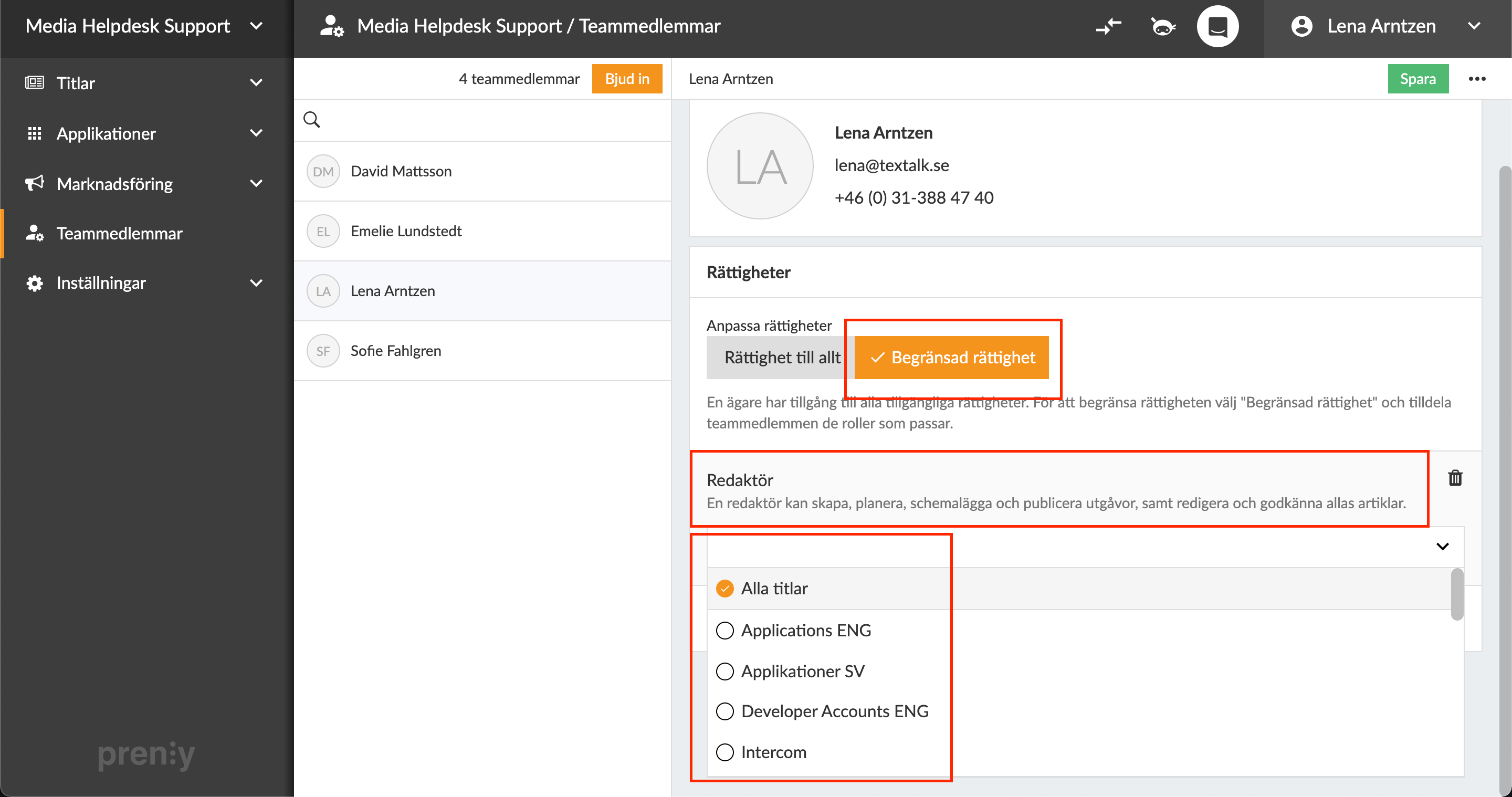 Rättighet till allt sätter vi alltid på huvudkontakten som är ägare till ert Prenly Workspace med just rollen Rättighet till allt. Det ger användaren tillgång till alla funktioner i systemet samt rätten att administrera och bjuda in nya teammedlemmar.