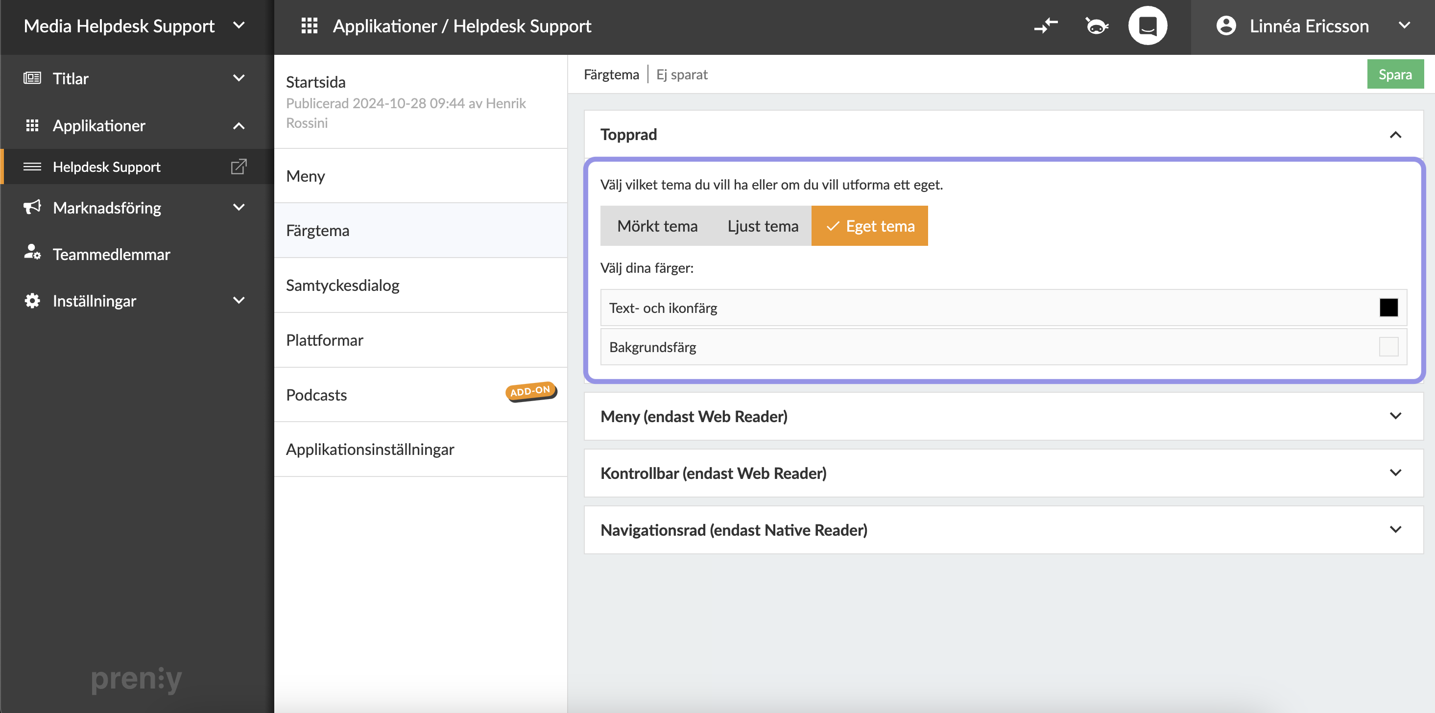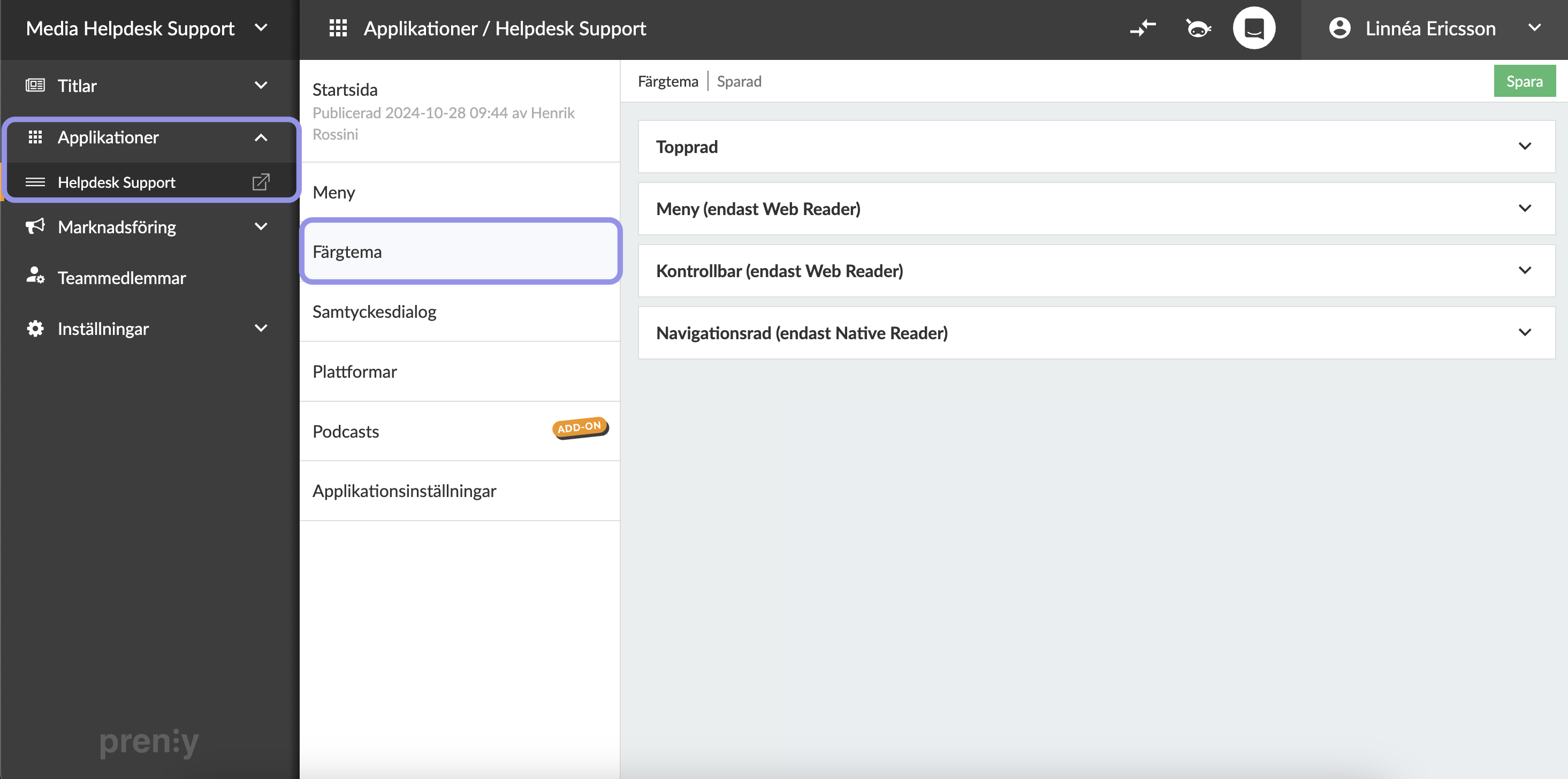 Börja med att logga in i Prenly Workspace och välj "Applikationer" och sen den applikation du önskar ändra. Välj sedan "Färgtema" för att visa färginställningarna.