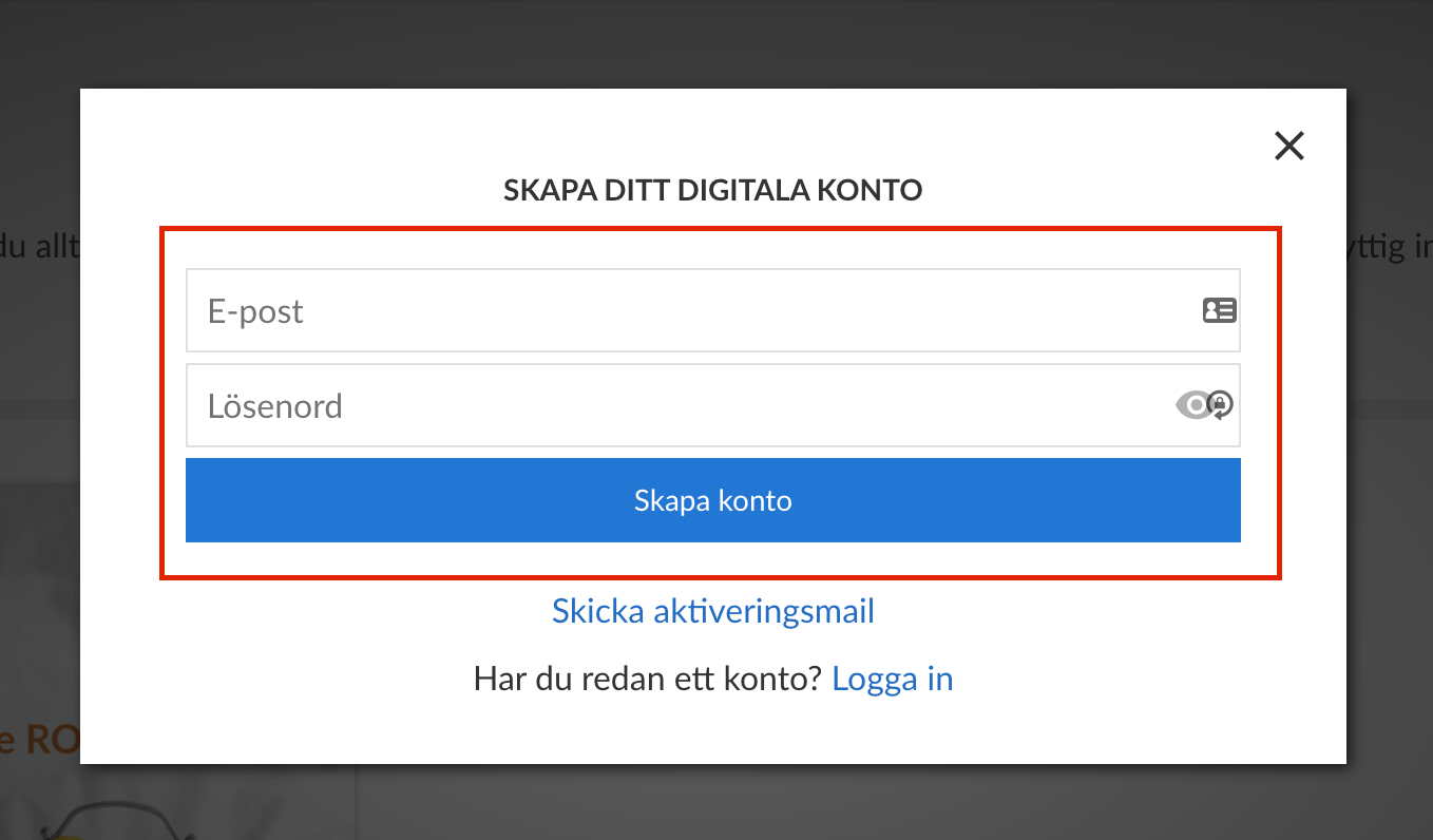 Fyll i din e-postadress och ditt önskade lösenord och klicka på den blå knappen “Skapa konto”.