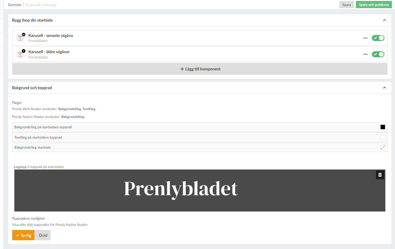 Notera: Om en checkbox är grå betyder det att komponenten saknar det innehåll som krävs och den går därmed inte att aktivera förrän den är komplett. En svart checkbox betyder att komponenten är inaktiv, men går att aktivera. En grön checkbox betyder att den är aktiverad men inte publicerad förrän du klickat på Spara och publicera - detta gör du när allt är klart.