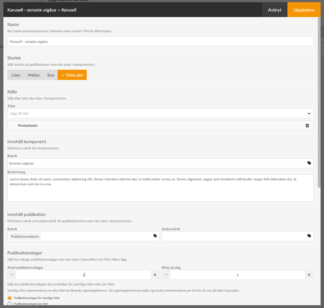 - Under Publikationsdagar väljer du först antal dagar av titeln som ska visas i karusellen. Tänk på att antal titlar som visas fullt ut beror på storlek du valt (se ovan) samt vilken enhet som startsidan visas i. I vårt fall sätter vi 1 publikationsdag för att endast visa den senaste publikationen.