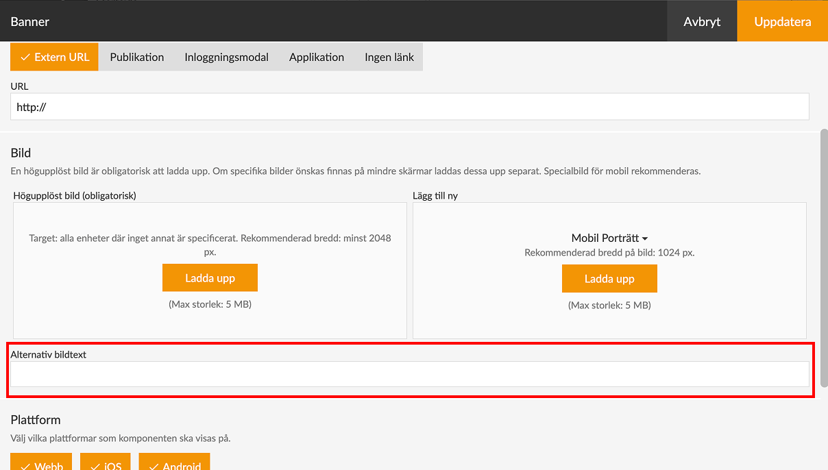 I banner-komponenten finns ett fält med "Alternativ bildtext" som du bör fylla i.