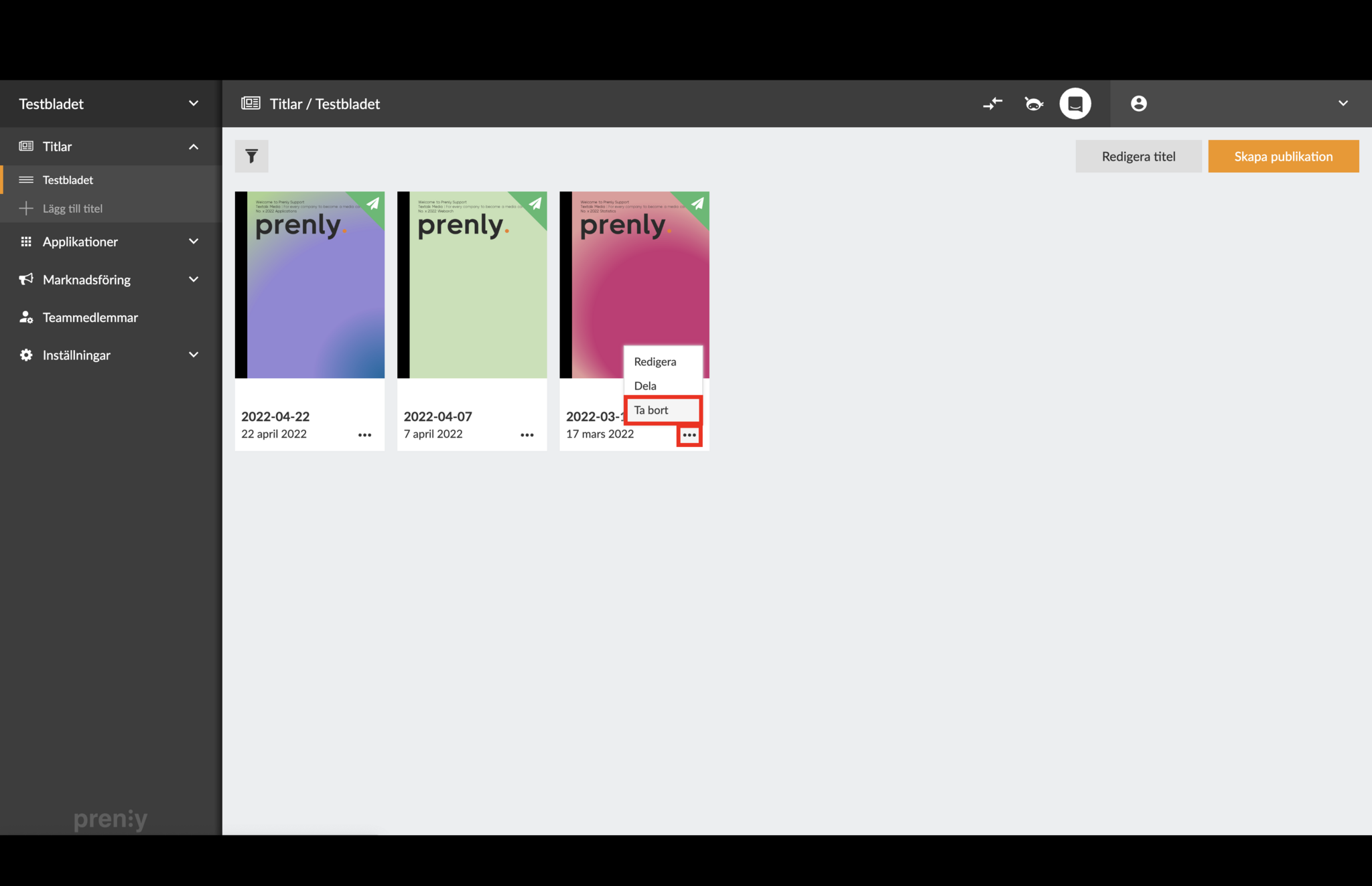 Radera publikationer - Prenly