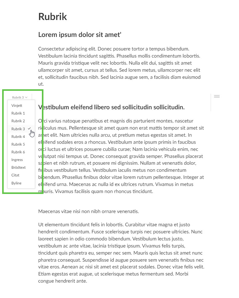- Skriv in rubrik och text samt addera eventuella bilder eller videor. Formatera textstycken genom att klicka på formatväljaren till vänster om textblocket.