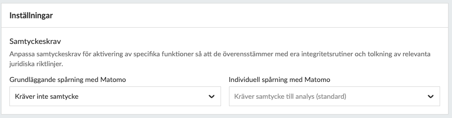 Om du vid "Grundläggande spårning med Matomo" väljer "Kräver inte samtycke" kommer data att skickas anonymt - utan användar-id - för de användare som inte gett samtycke till analys.