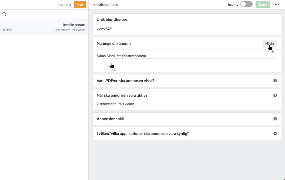 Du kan när som helst skapa en ny eller administrera en äldre insticksannons i Prenly Workspace.