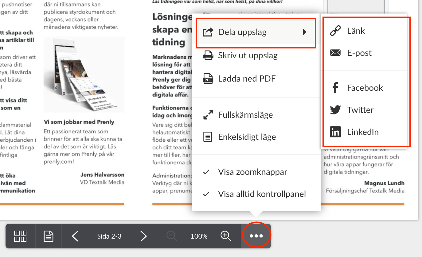 Väl inne i utgåvan finns en meny i mitten --> klicka på "tre-pricks menyn" --> och välj därefter "dela uppslag" från PDF-läget. Här får ni upp alla de olika sätt och plattformar man kan dela uppslag eller artikel till.